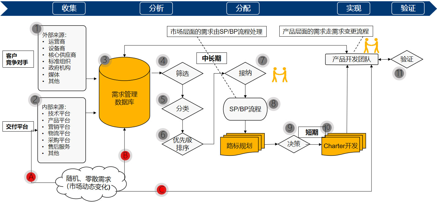 需求管理对市场和客户需求相关的事务进行了规范化定义,包括从不同渠道收集内外部需求,进行需求分析、分发、实现,最后进行需求验证的全过程。需求管理提供一种更为面向市场和客户的方法收集高业务价值的产品包需求,支撑公司/产品线不断取得成功。通过需求管理开展收益、风险和优先级评估,可以更有效地挖掘价值需求,交付满足市场和客户需求的需求库,为产品包提供基础。需求管理为有效收集、分析、分发、实现和验证产品包需求提供流程、方法和指标。